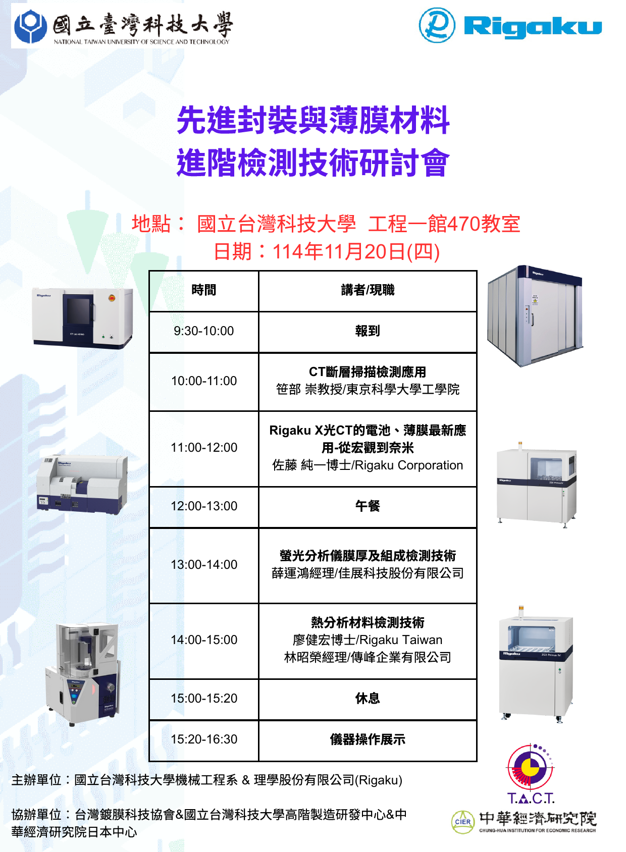 RIGAKU 先進封裝與薄膜材料 進階檢測技術研討會 日期:2025.11.20(四) 時間:09:30 - 16:30 地點:106臺北市大安區基隆路四段43號 (國立台灣科技大學 工程一館 470 教室) 報名連結:https://docs.google.com/forms/d/e/1FAIpQLSeDGqWtqyobTkRFk4jEx0OBavZlfqgxtpVkyQhRQMy5rb-mDw/viewform?pli=1 邀請您參加研討會 ! 詳細資訊,請見官網:https://www.facebook.com/share/1Gy5C7zv1b/?mibextid=wwXIfr 議程表