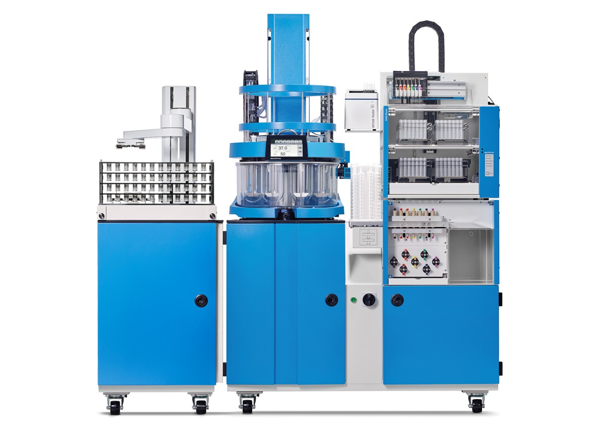 因應每日繁瑣的的溶離試驗,瑞士Sotax從1992年發展第一台真正的全自動溶離機,滿足世界各大藥廠每日大量批次的溶離試驗。全程由機器包辦,從溶媒配置、投藥、溶離、取樣、UV分析、收集、清洗、更換過濾膜,皆可程式設定。大幅降低試驗配置的時間,更有效提升溶離試驗產能。最大連續17批次USP1/2試驗。降低OOS機率。